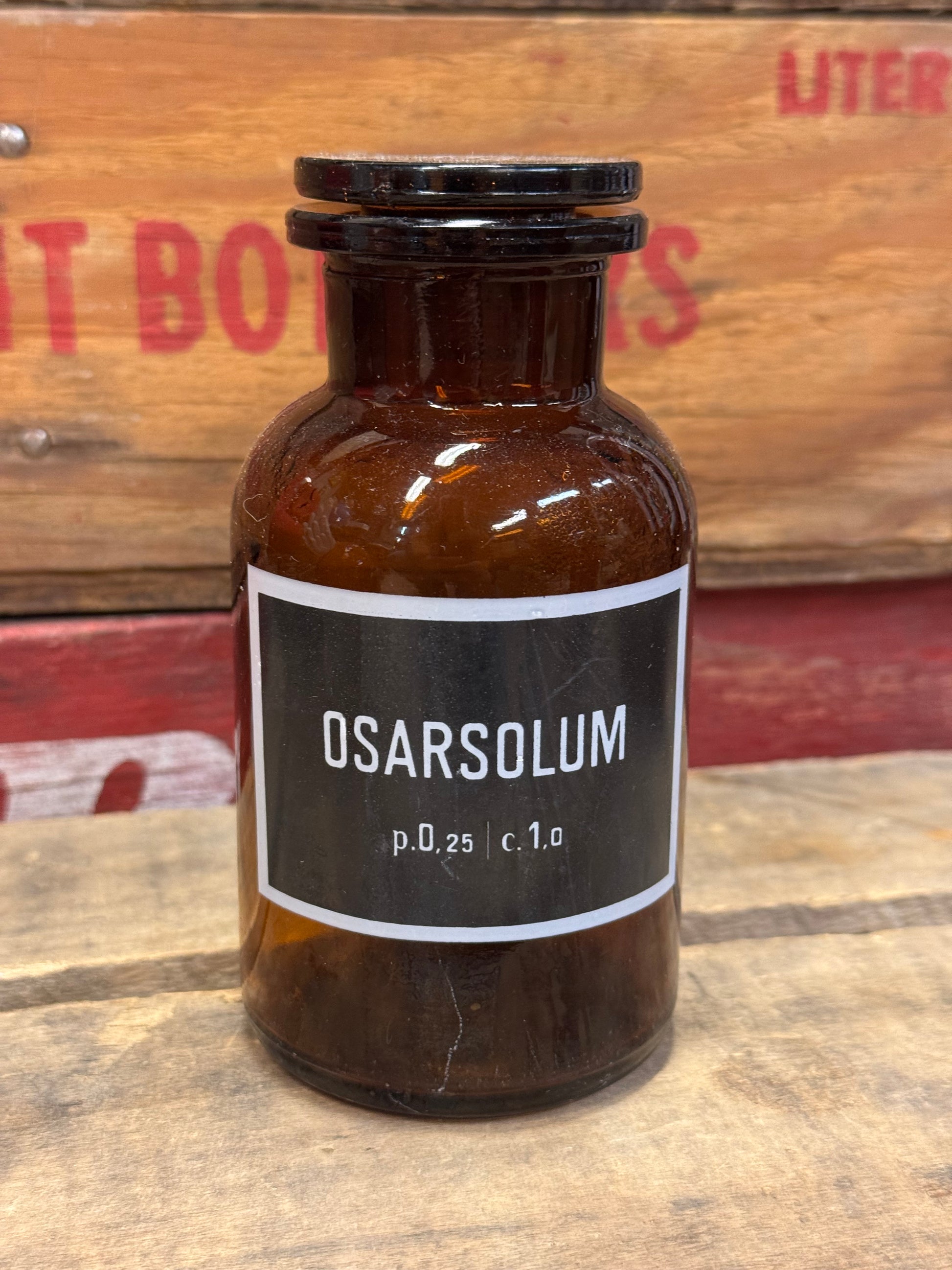 brun apotekerflaske med etiketten "OSARSOLUM". H13cm