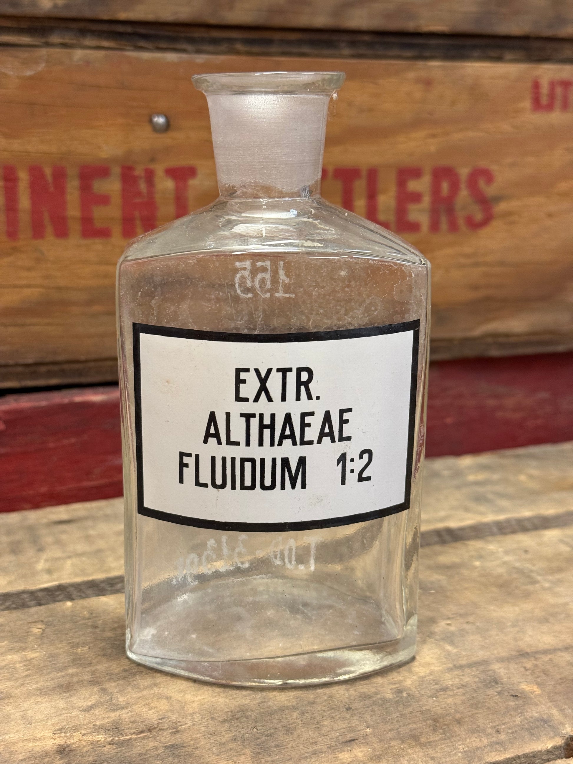 - Ekstraktet er mærket som "EXTR. ALTHAEAE FLUIDUM 1:2", hvilket indikerer et flydende ekstrakt i forholdet 1 del plante til 2 dele opløsningsmiddel.