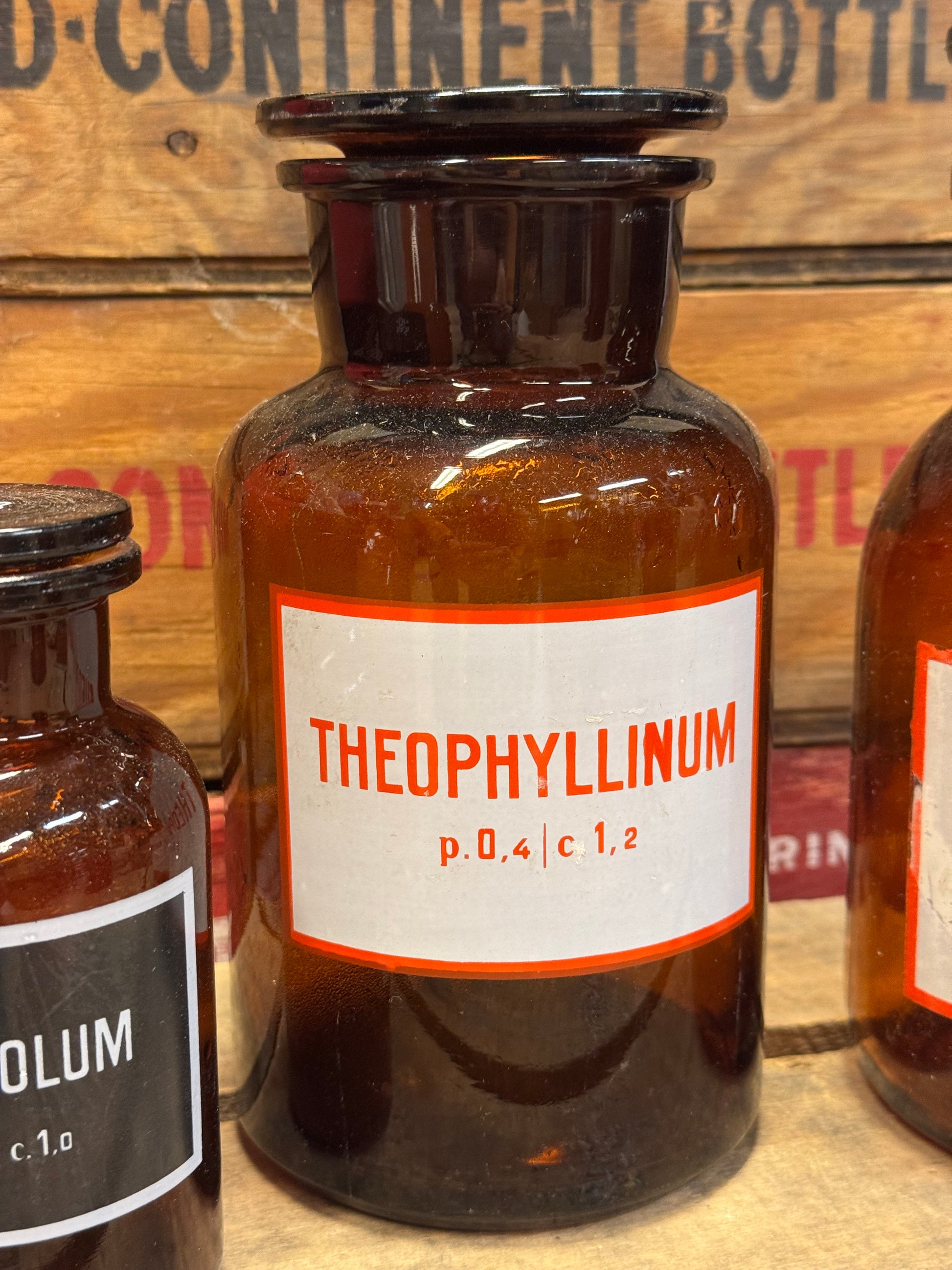 Teksten på etiketten, "THEOPHYLLINUM", refererer til lægemidlet theophyllin, som bruges til behandling af luftvejssygdomme som astma og KOL.
