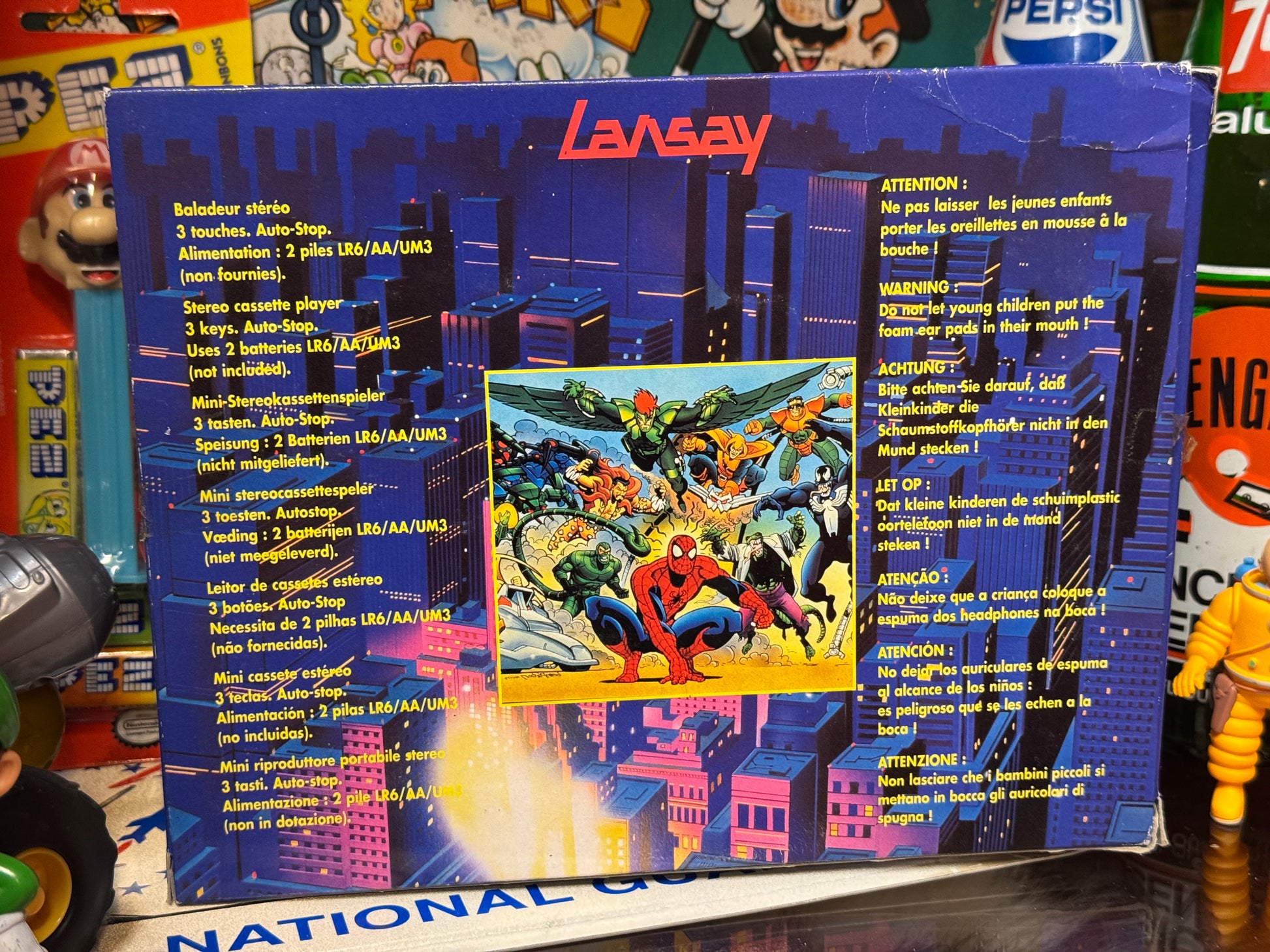 Lansay Spider-Man bærbar kassetteafspiller fra 1996, en sjælden samlergenstand.