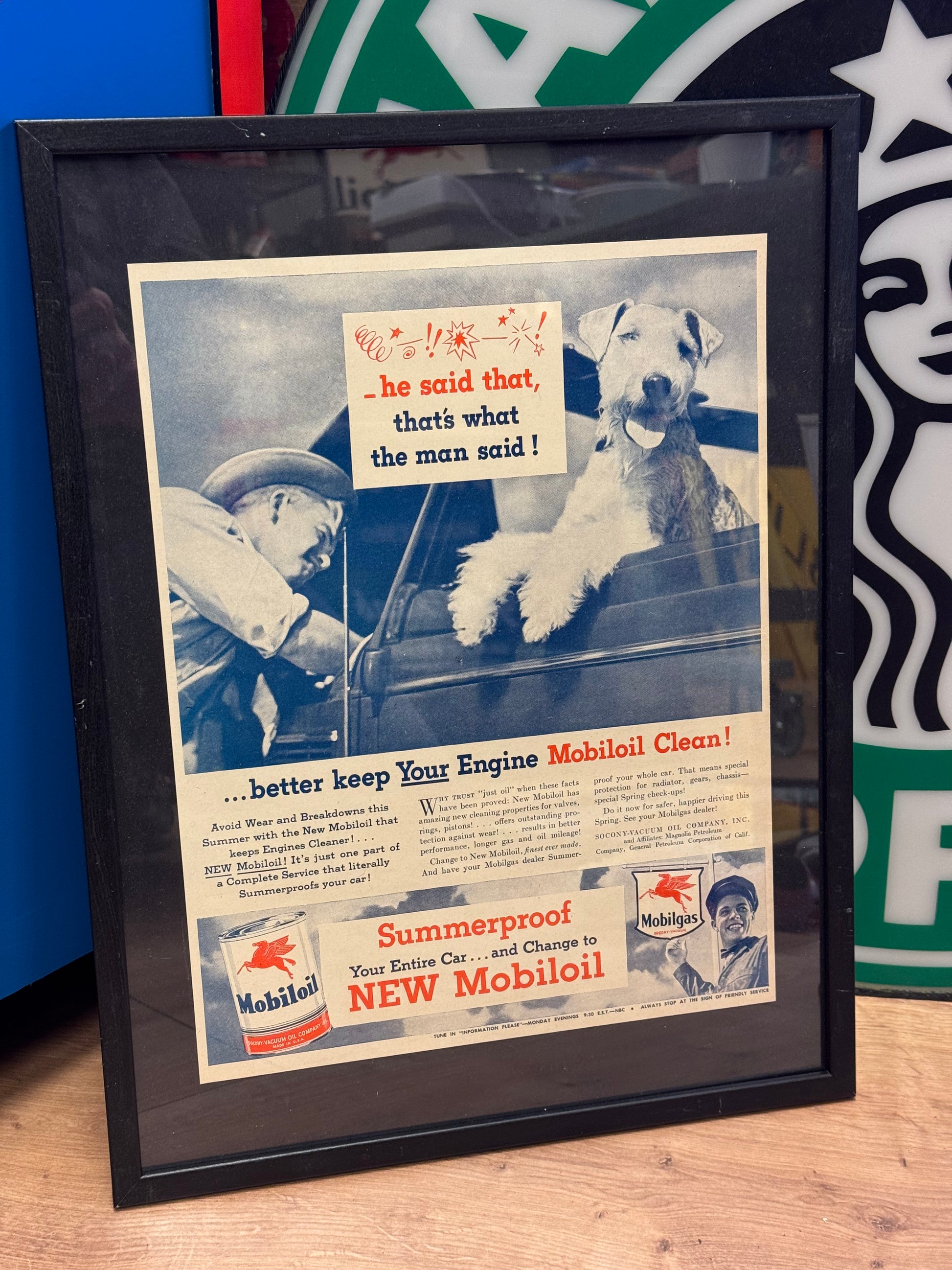 indrammet vintage-reklame for motorolien Mobiloil. 30x40cm