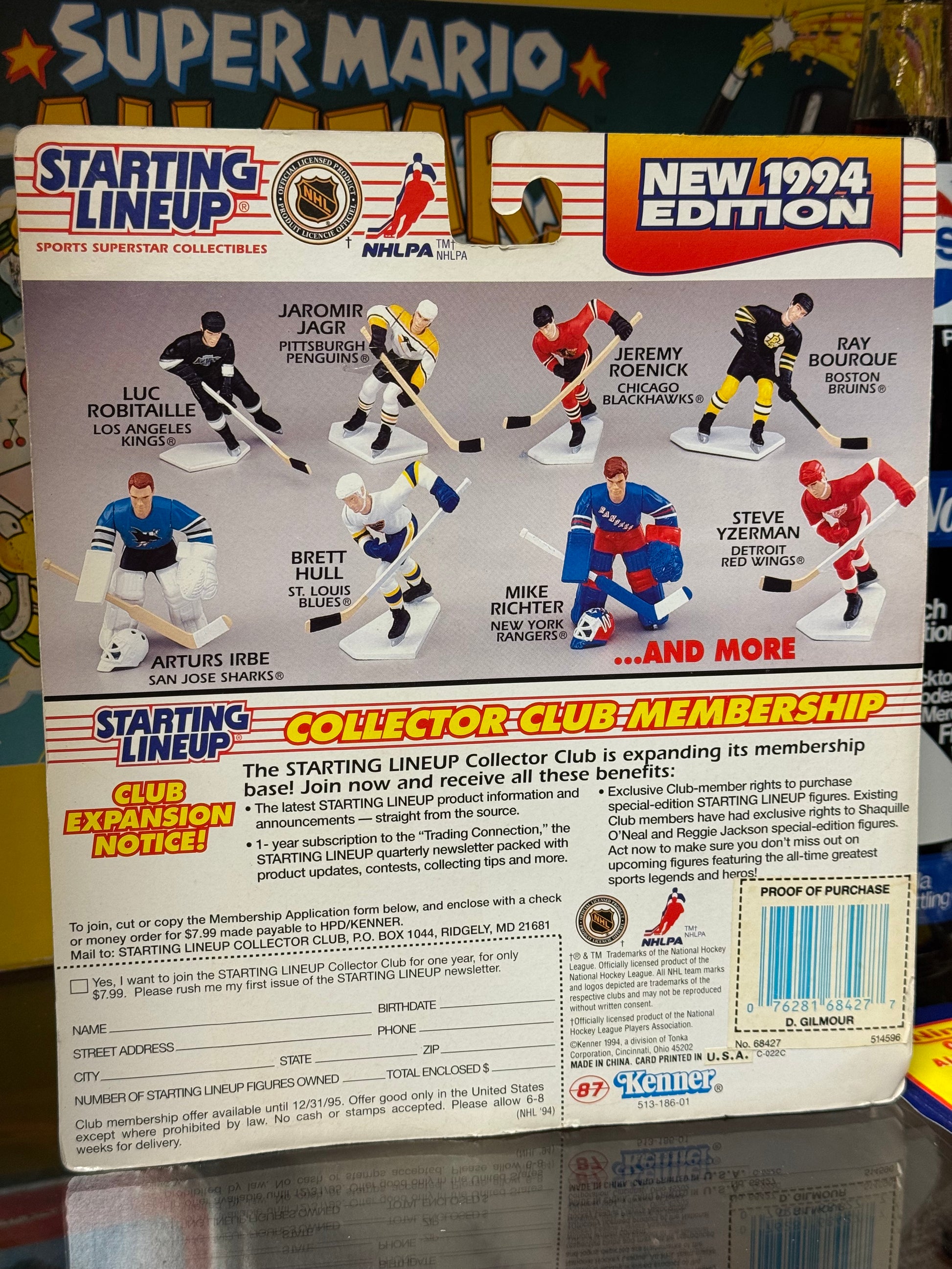 1994 Kenner NHL Starting Lineup Doug Gilmour actionfigur fra Toronto Maple Leafs, der stadig er forseglet i sin originale emballage