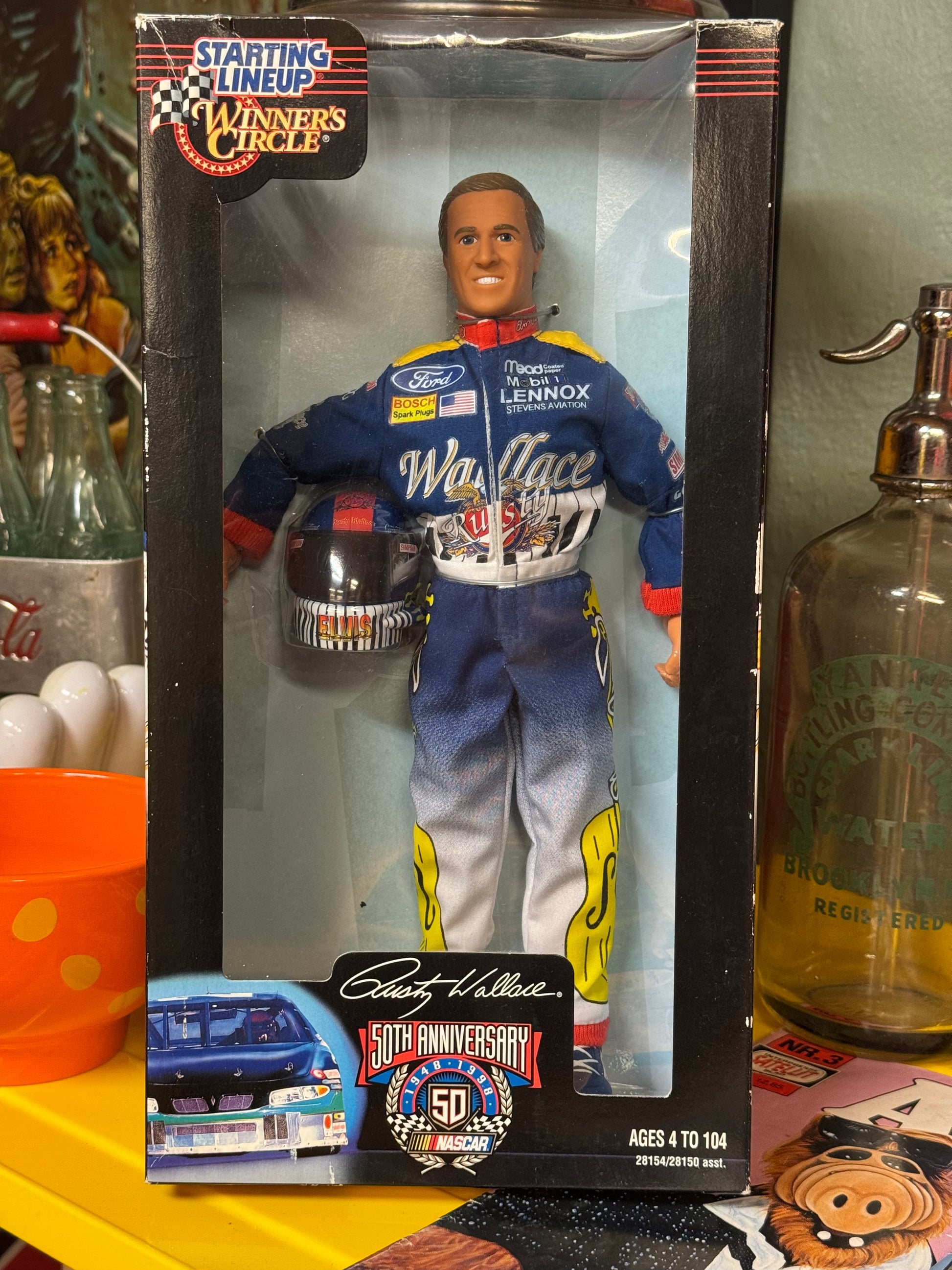 Dette er en "Starting Lineup Winner's Circle" actionfigur af Rusty Wallace, en kendt NASCAR-kører.