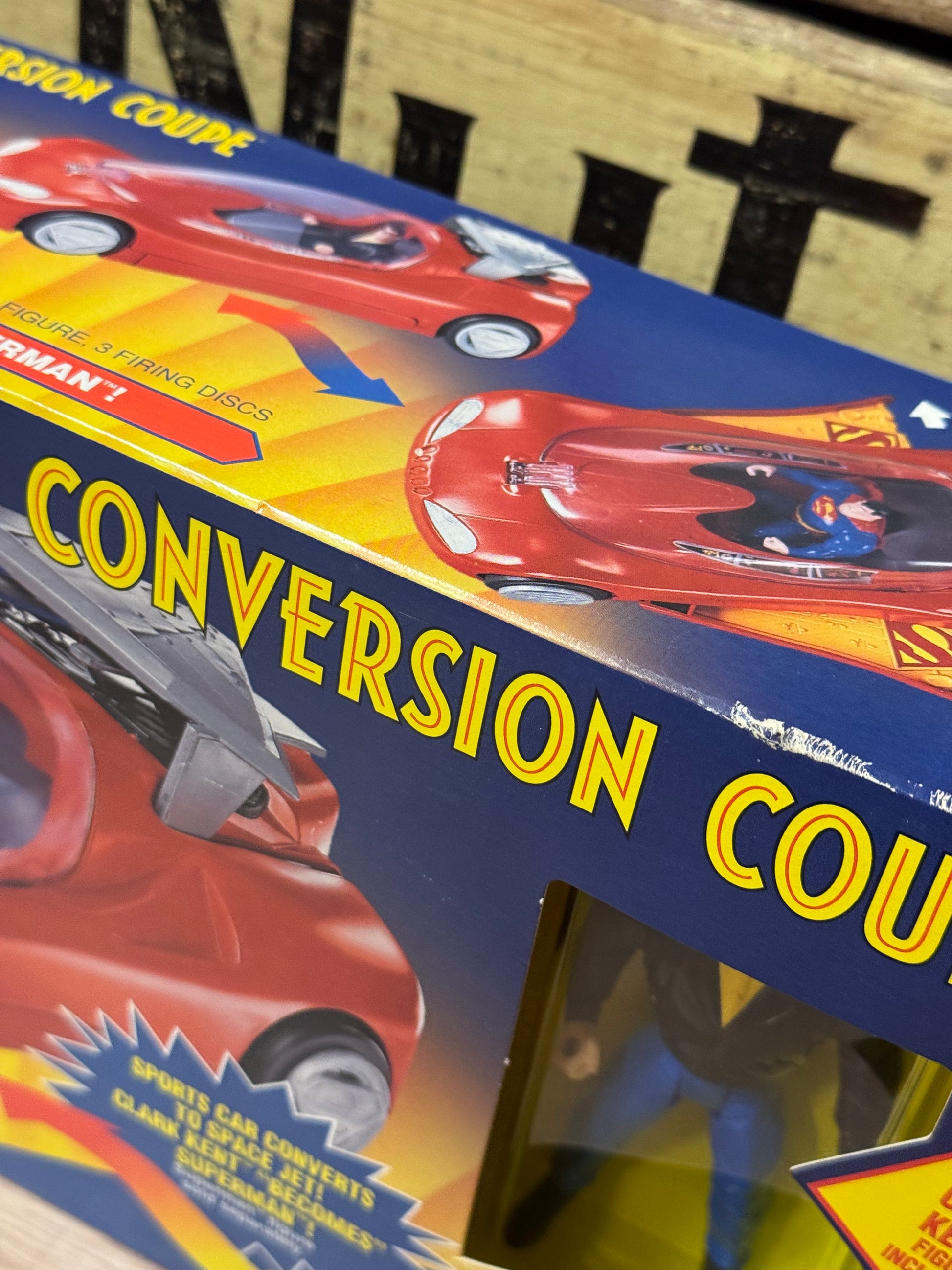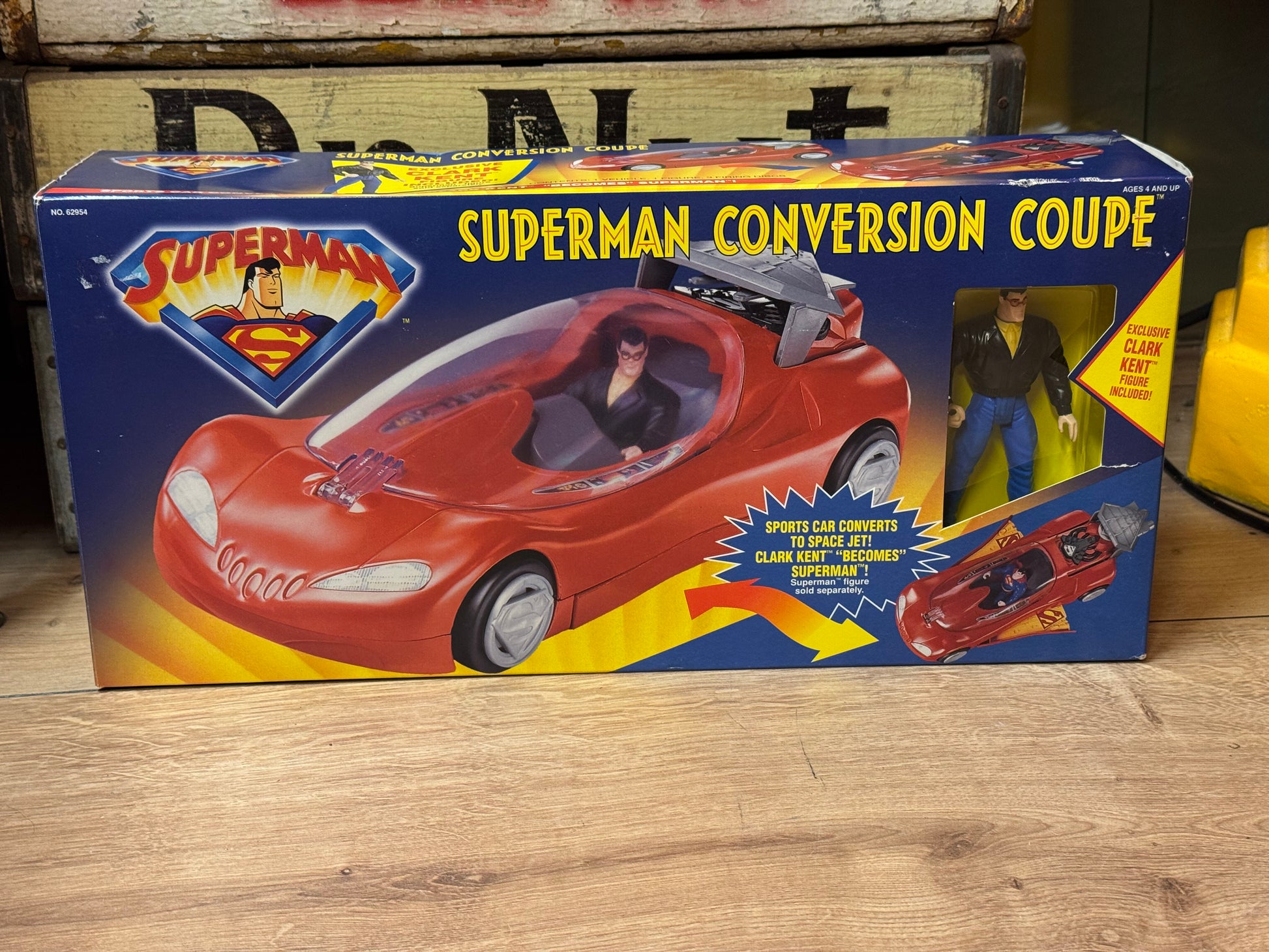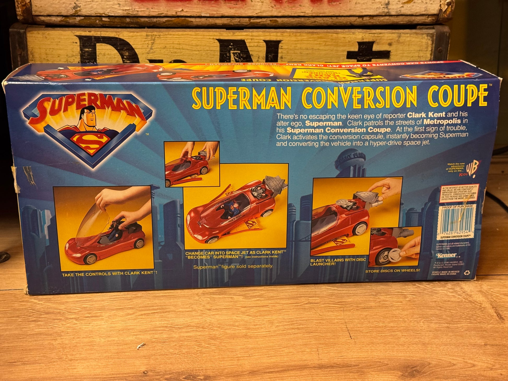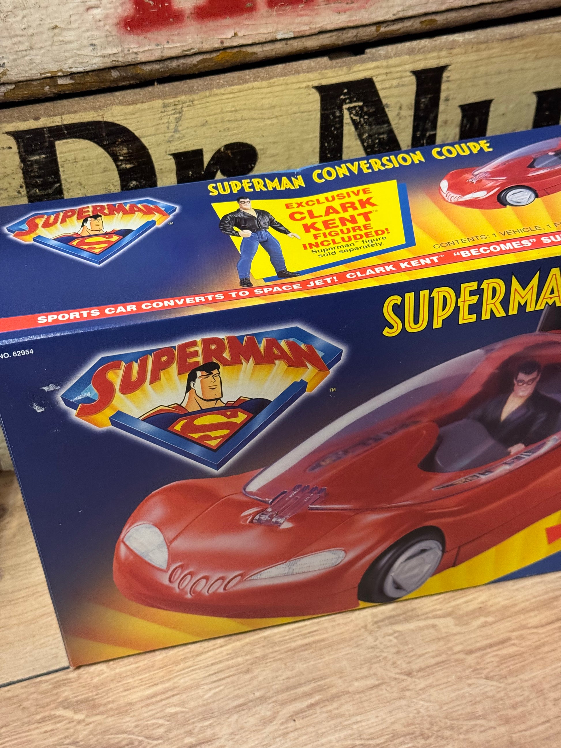 Billedet viser en Kenner Superman Conversion Coupe legetøjsbil fra 1996.