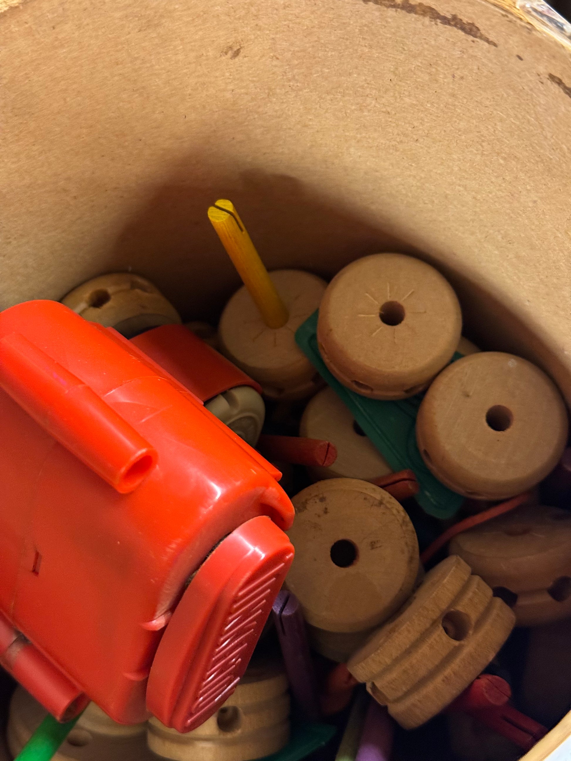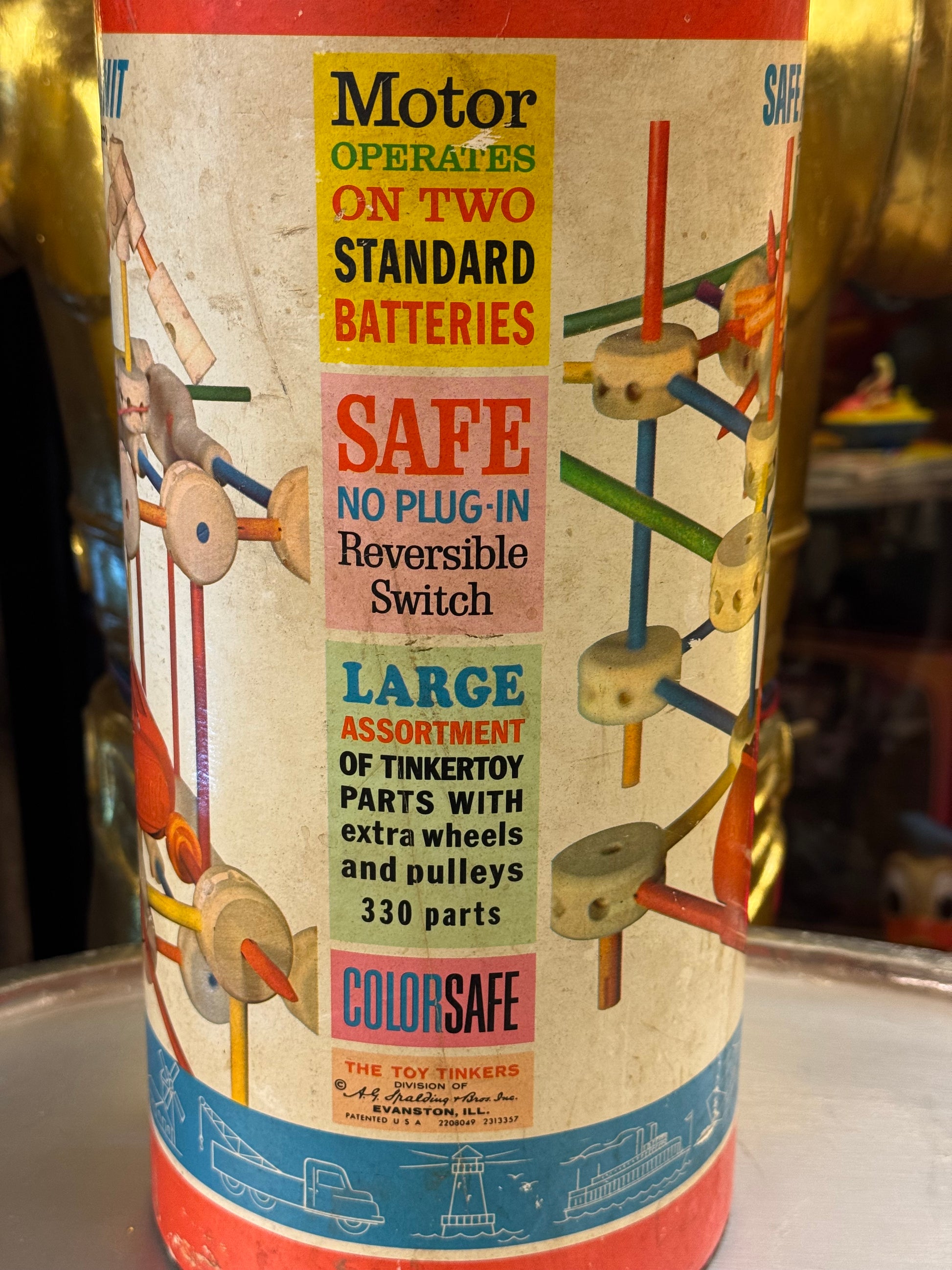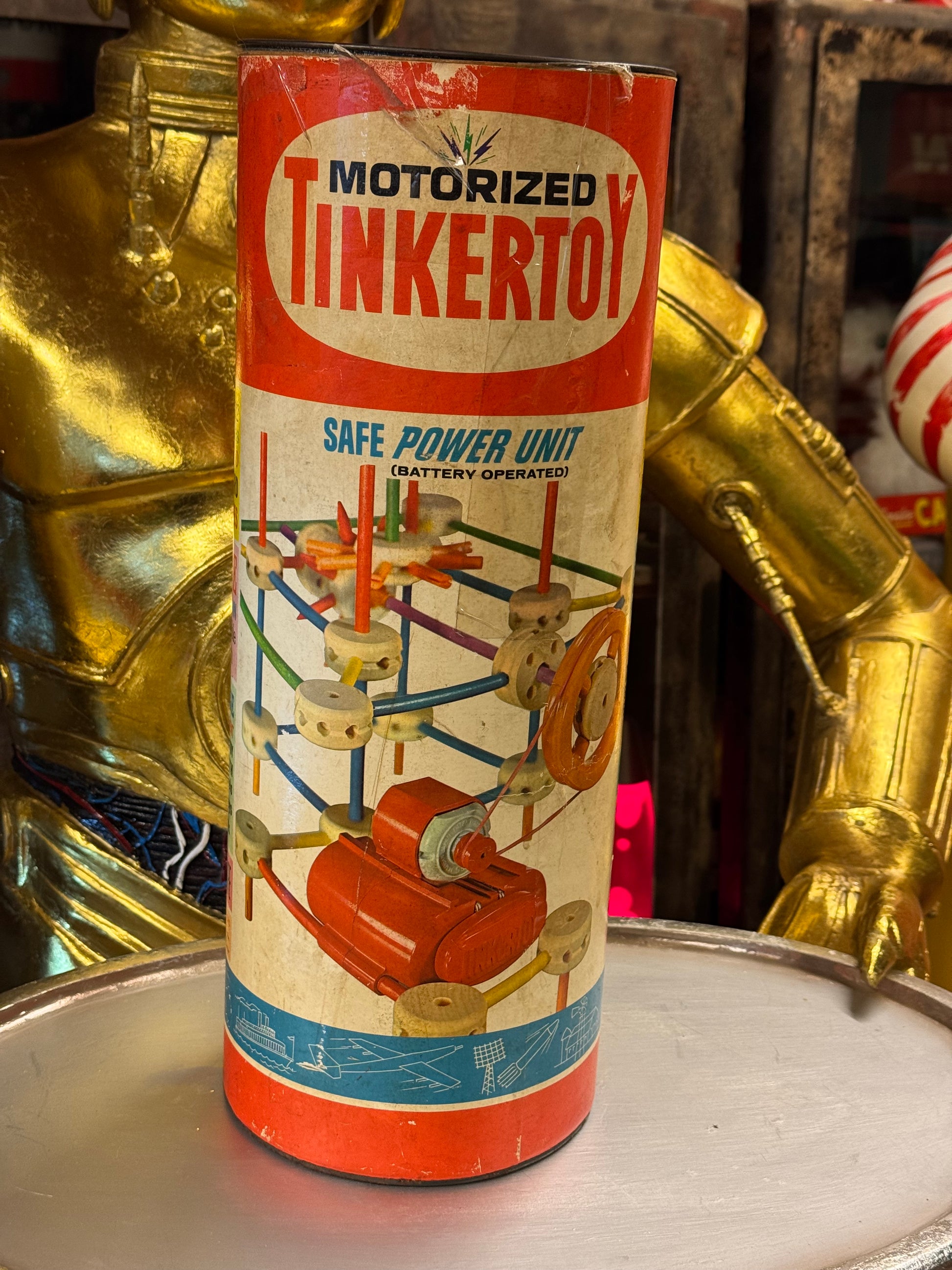 Vintage Tinkertoy fra 1950erne. Masser af dele! Komplet vides ikke. Men ellers super dekorativ til hylde, grafisk flot!