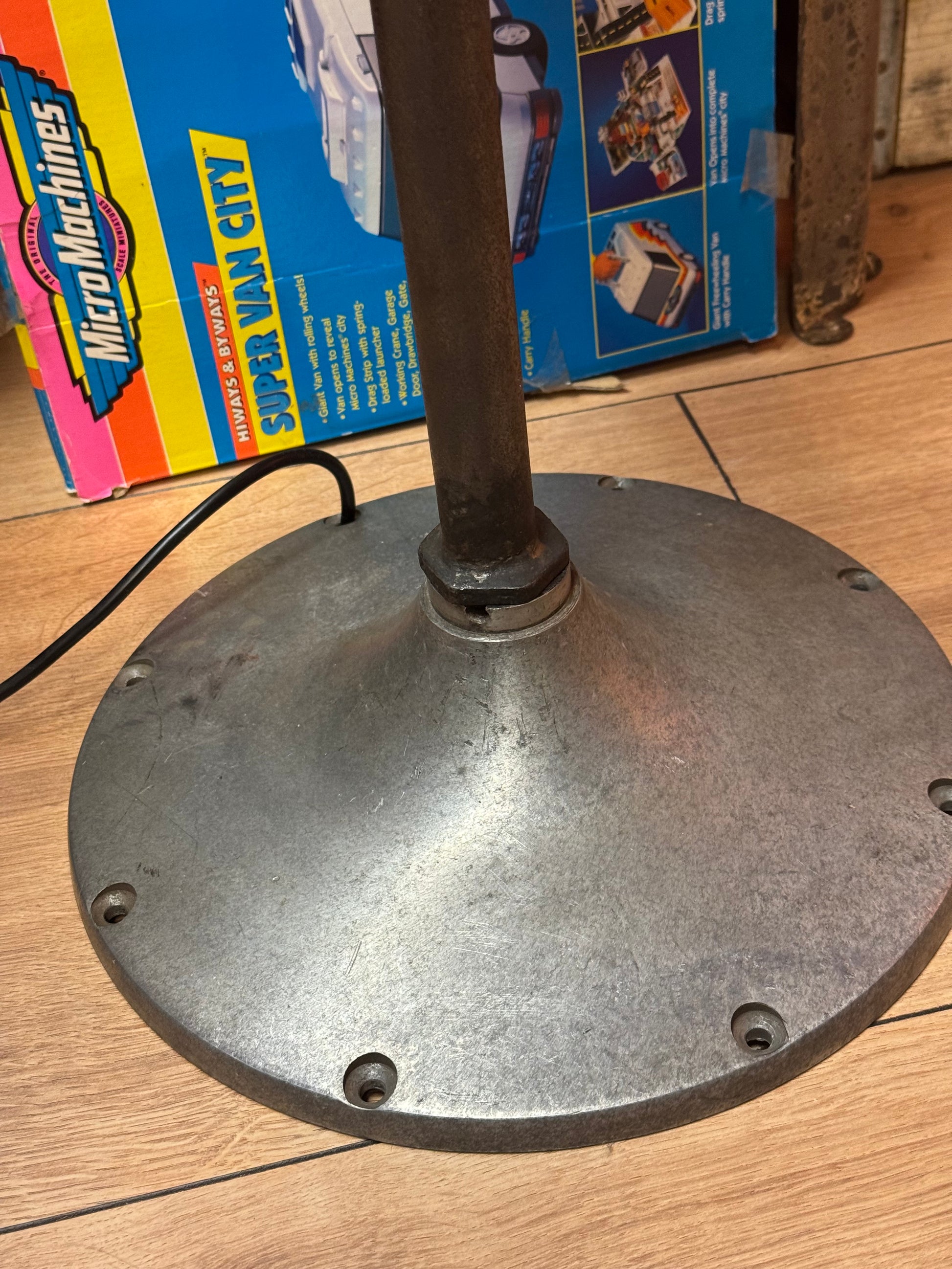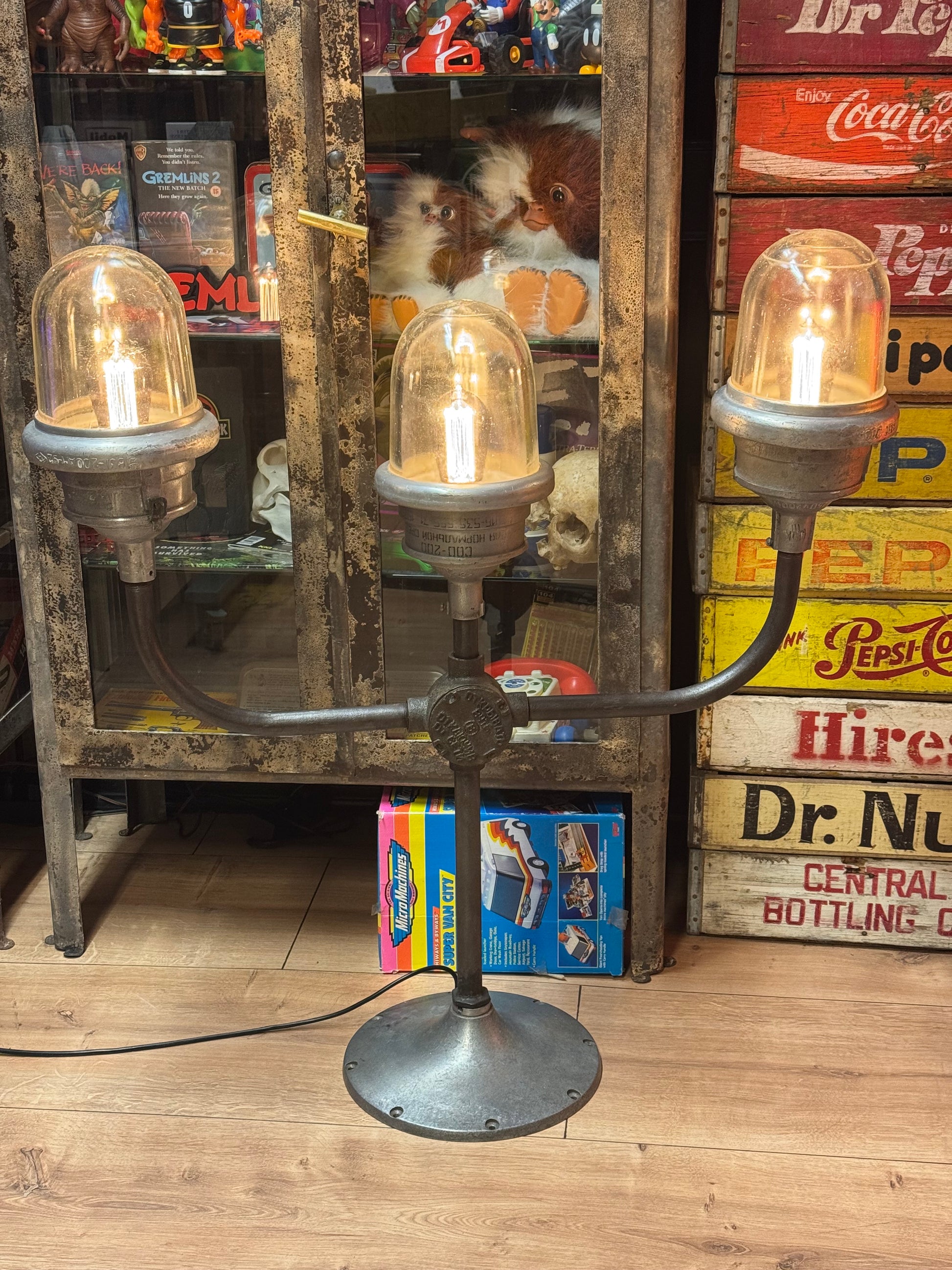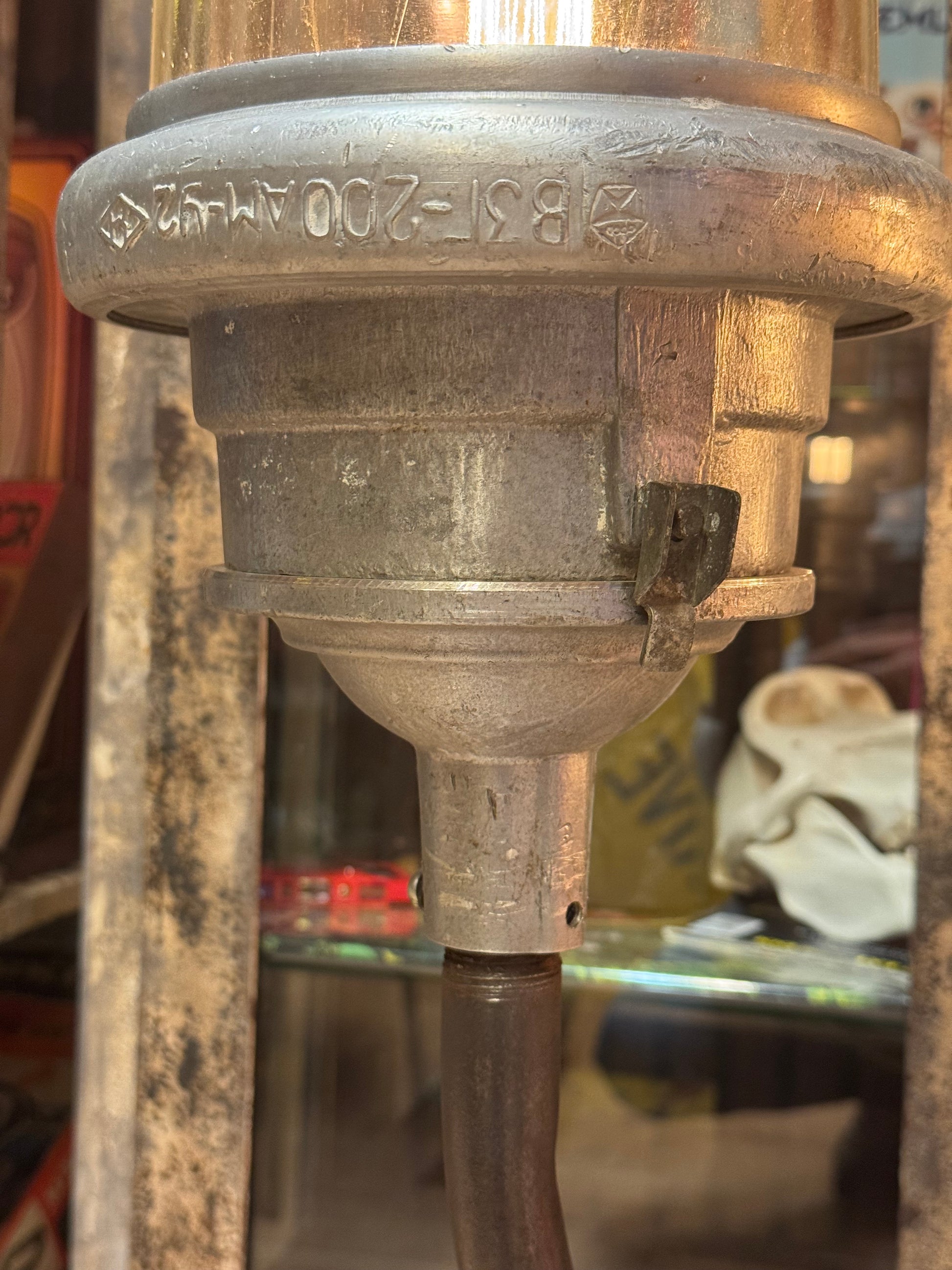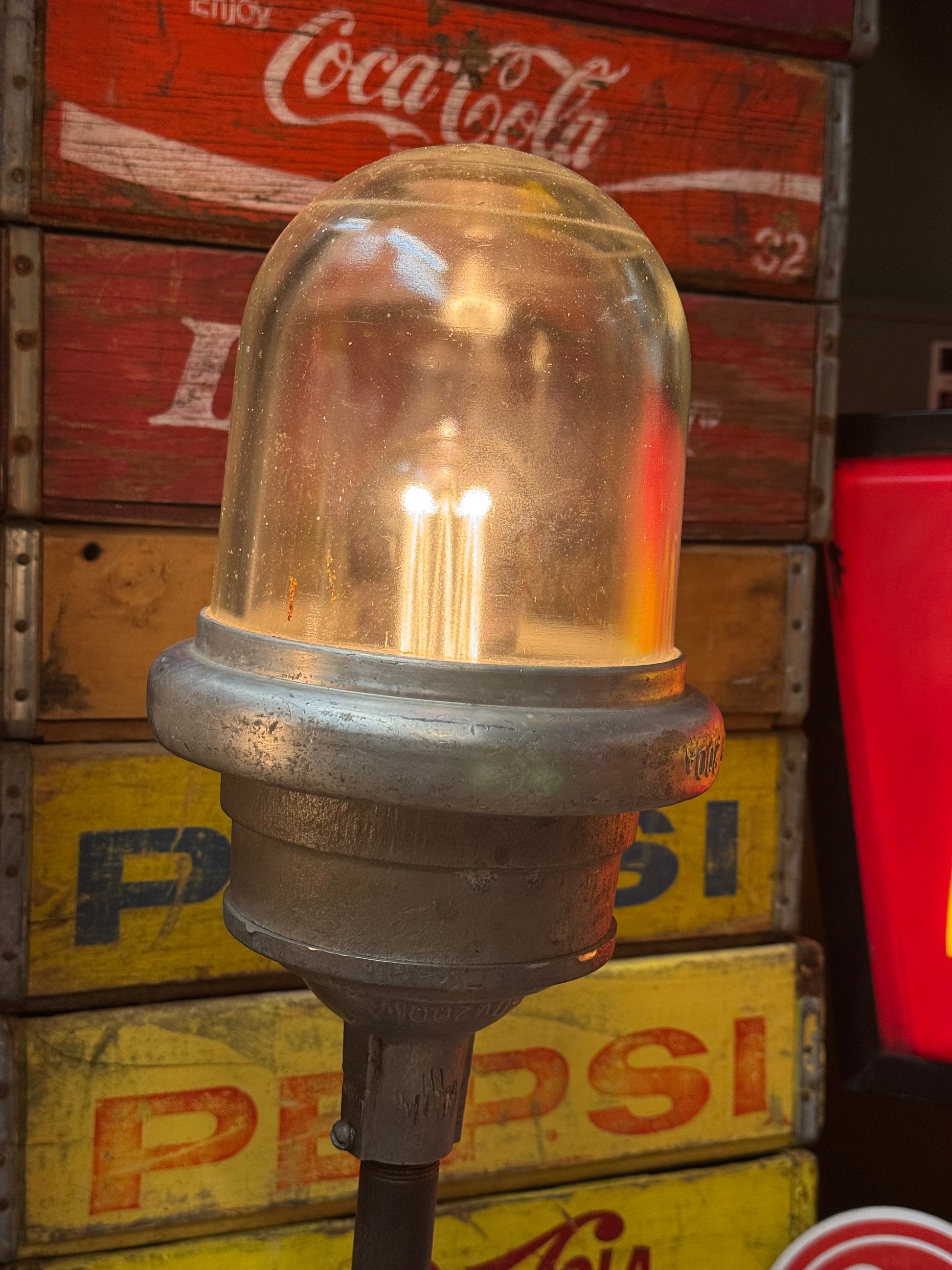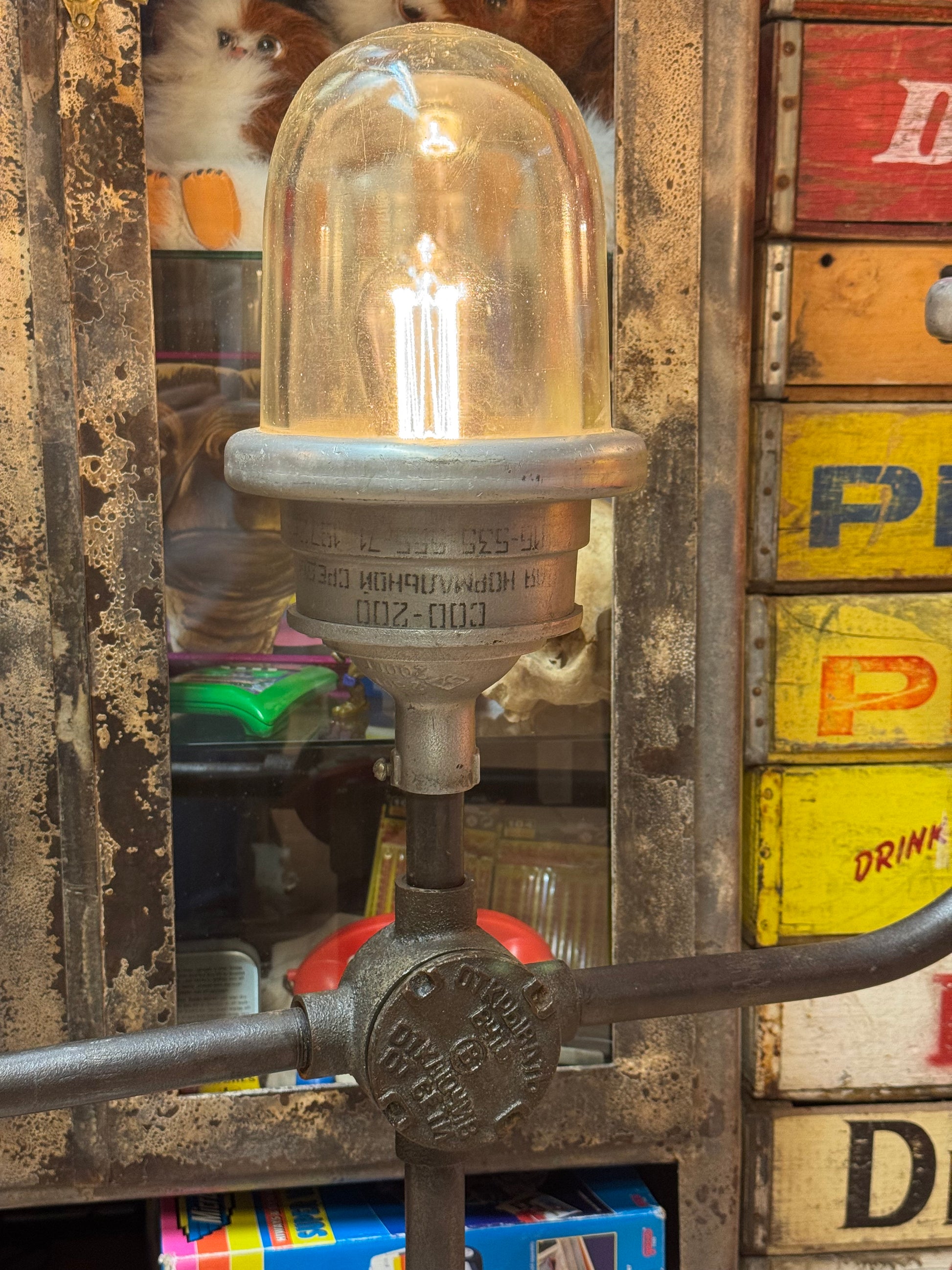 Gamle bunker lamper som er eftermonteret på noget industrielt lækkeri